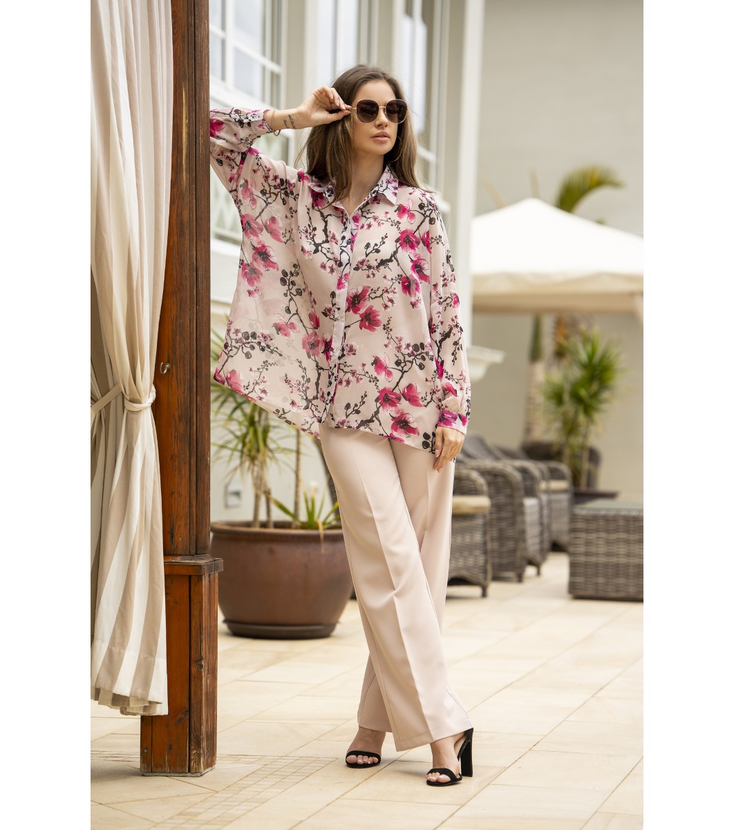 Shirt A513 Oversized chiffon shirt with wide, gathered cuffs and fastened with transparent buttons.  Presented size: 36, model's height: 172 cm Shirt A513 Oversized chiffon shirt with wide, gathered cuffs and fastened with transparent buttons. Presented size: 36, model's height: 172 cm