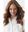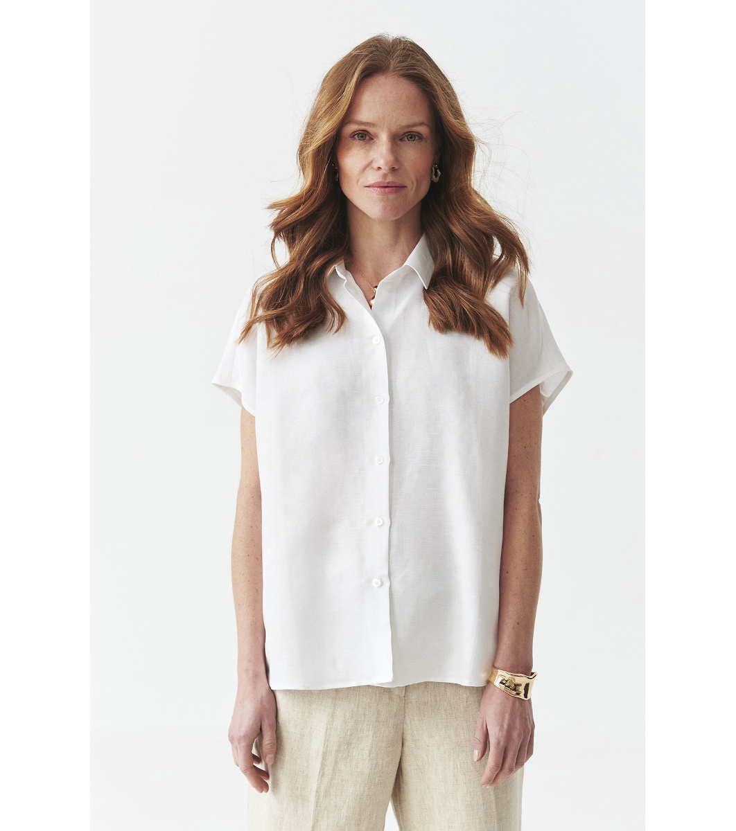 Cămașă de damă cu croială dreaptă și mâneci scurte. Guler clasic și închidere cu nasturi în față. Spate neted cu cusătură orizontală în partea de sus. Tiv inferior ușor rotunjit.