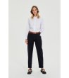 Cămașă clasică, cu croială dreaptă. Închidere cu nasturi pe toată lungimea în față. Guler cămașă. Mâneci lungi cu manșete și închidere cu nasturi. Ochiuri metalice decorative în față, de-a lungul liniei pliurilor. Tiv curbat. Design neted, în culoare uni. Pliuri în față și în spate, în partea de sus.