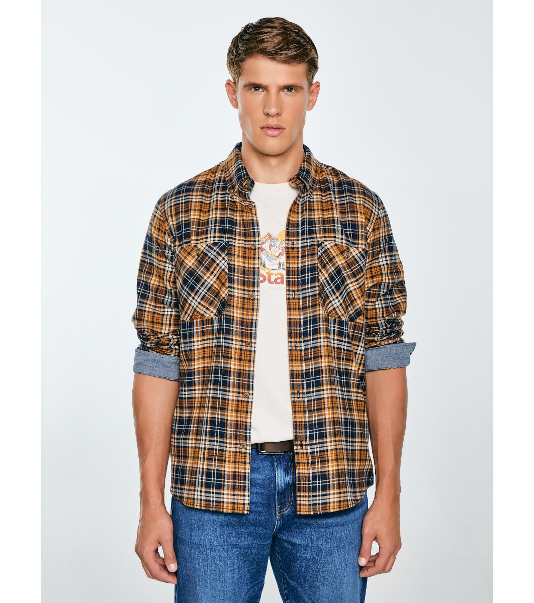 Big Star Cămașă bărbătească din bumbac în carouri, albastră și galbenă, KOLISAR Cămașă lungă bărbătească, cu siluetă dreaptă și mâneci lungi.