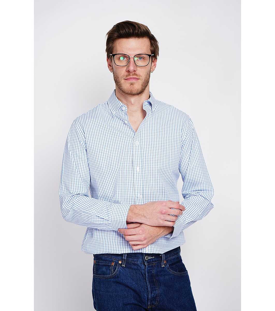 William de Faye Cămașă bărbătească din bumbac în carouri în albastru și alb Guler clasic și nasturi pentru închidere