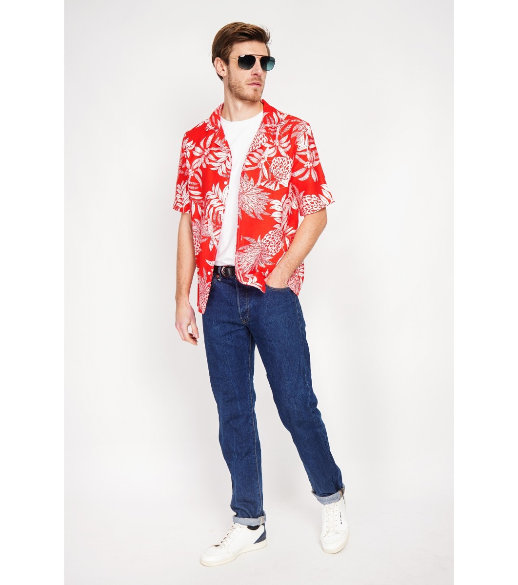 Cămașă bărbătească roșie cu mânecă scurtă și imprimeu floral ROUGE