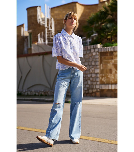 Cămașă de damă din bumbac alb cu imprimeu albastru