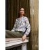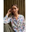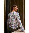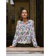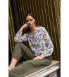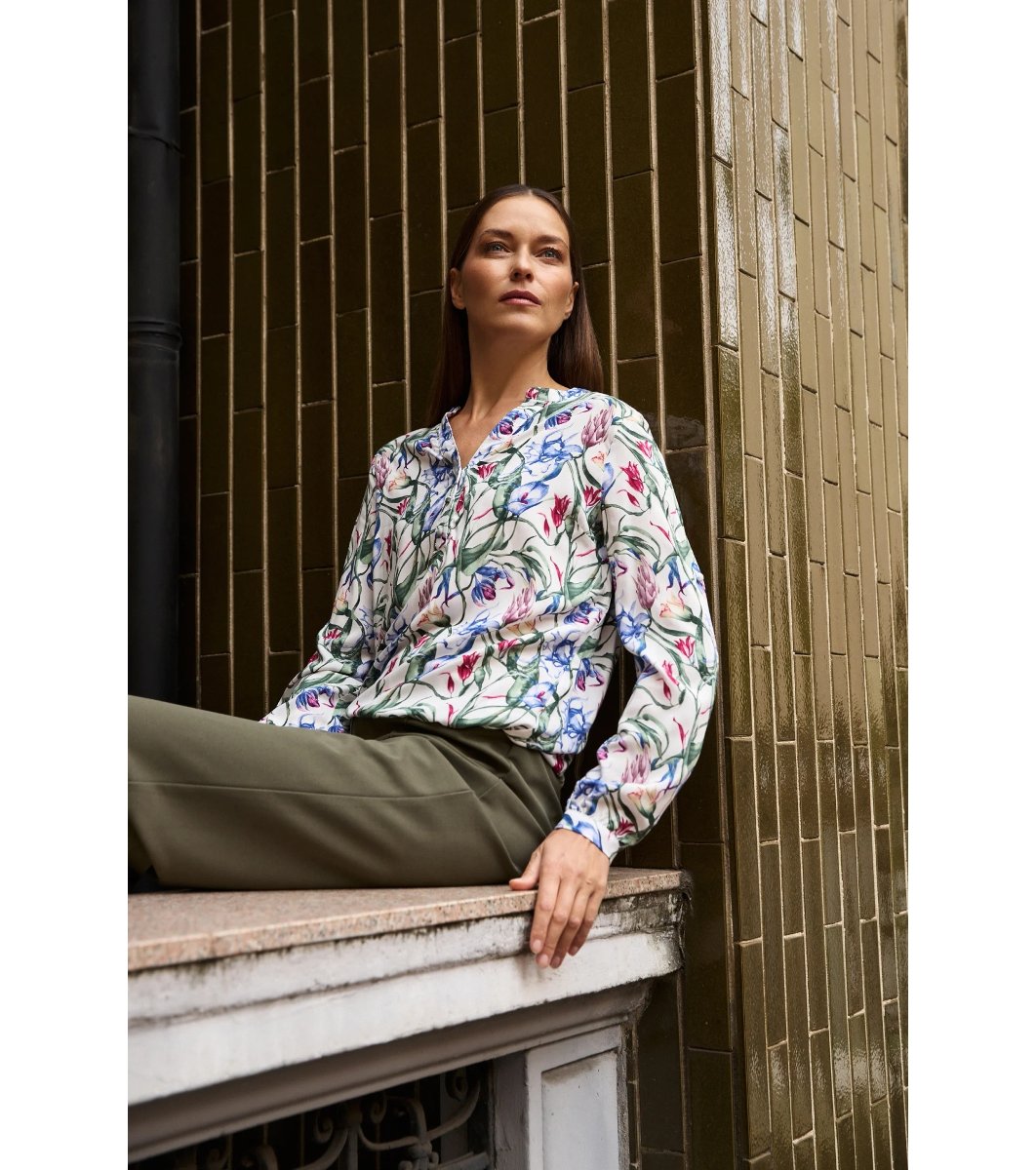 Cămașă cu linie dreaptă. Decolteu în V cu nasture scurt ascuns în față. Mâneci lungi cu manșete elastice. Spate cu tiv rotunjit. Imprimeu floral peste tot. Material ușor și fluid.