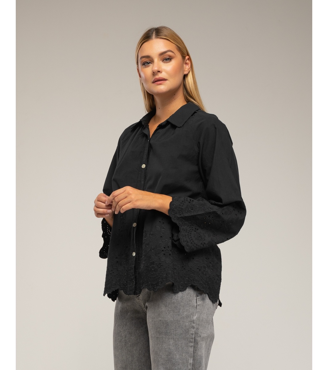 Cămașă neagră supradimensionată din bumbac pentru femei, cu broderie englezească