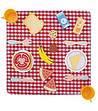 În el veți găsi: o față de masă elegantă în carouri, un set de pahare, tacâmuri, farfurii, banană, pepene verde, sandviș, brânză galbenă...