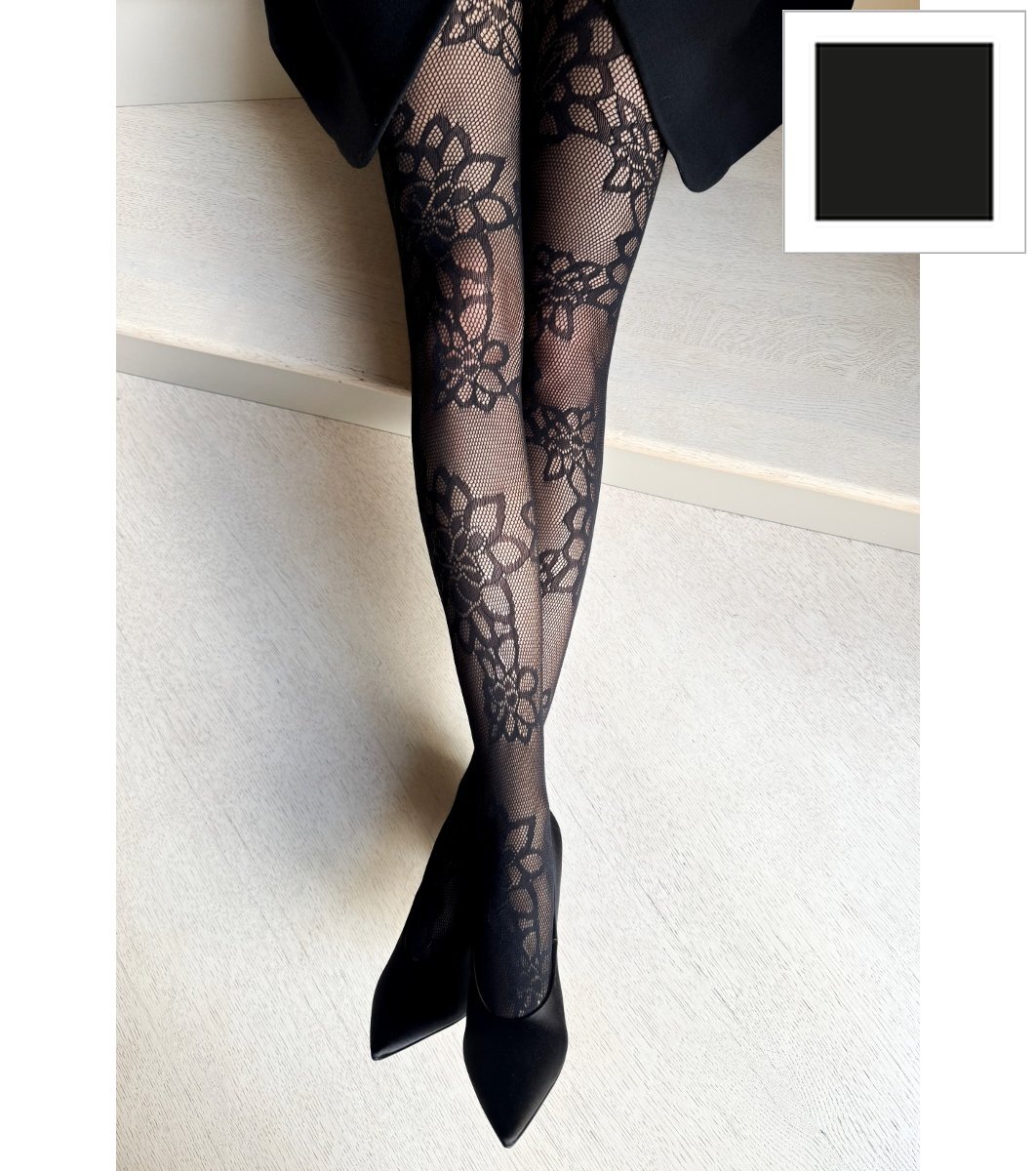 Veneziana Colanți FRANCESCA negri cu flori mari ajurate