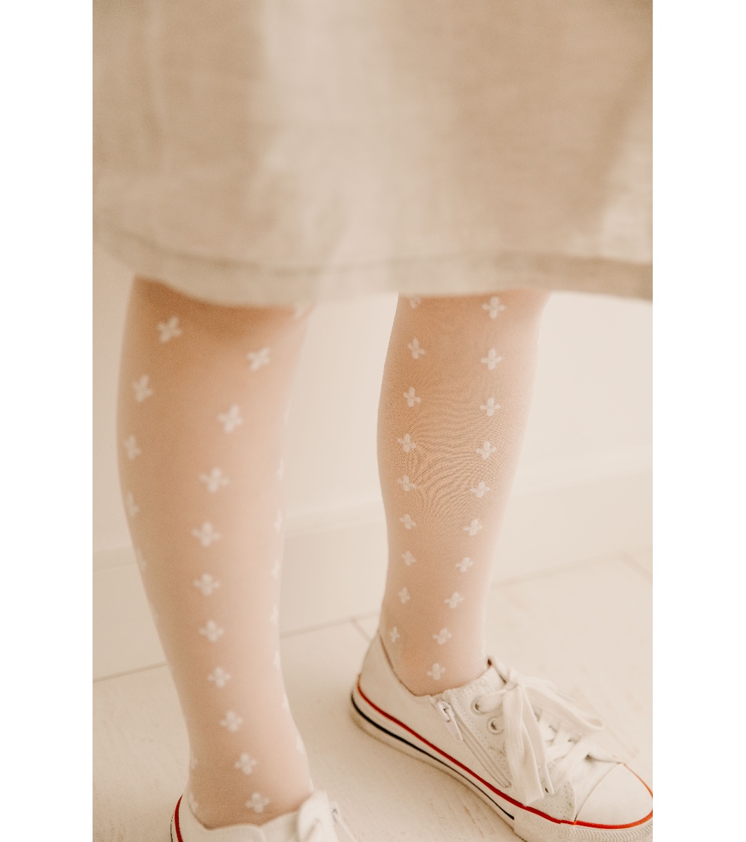 Colanți pentru copii cu o densitate subțire de 15 DEN și un model figurat cu cruci mici pe toată lungimea piciorului. Sunt confecționați dintr-un material tricotat moale, elastic, potrivit pentru purtarea zilnică de către copii.
