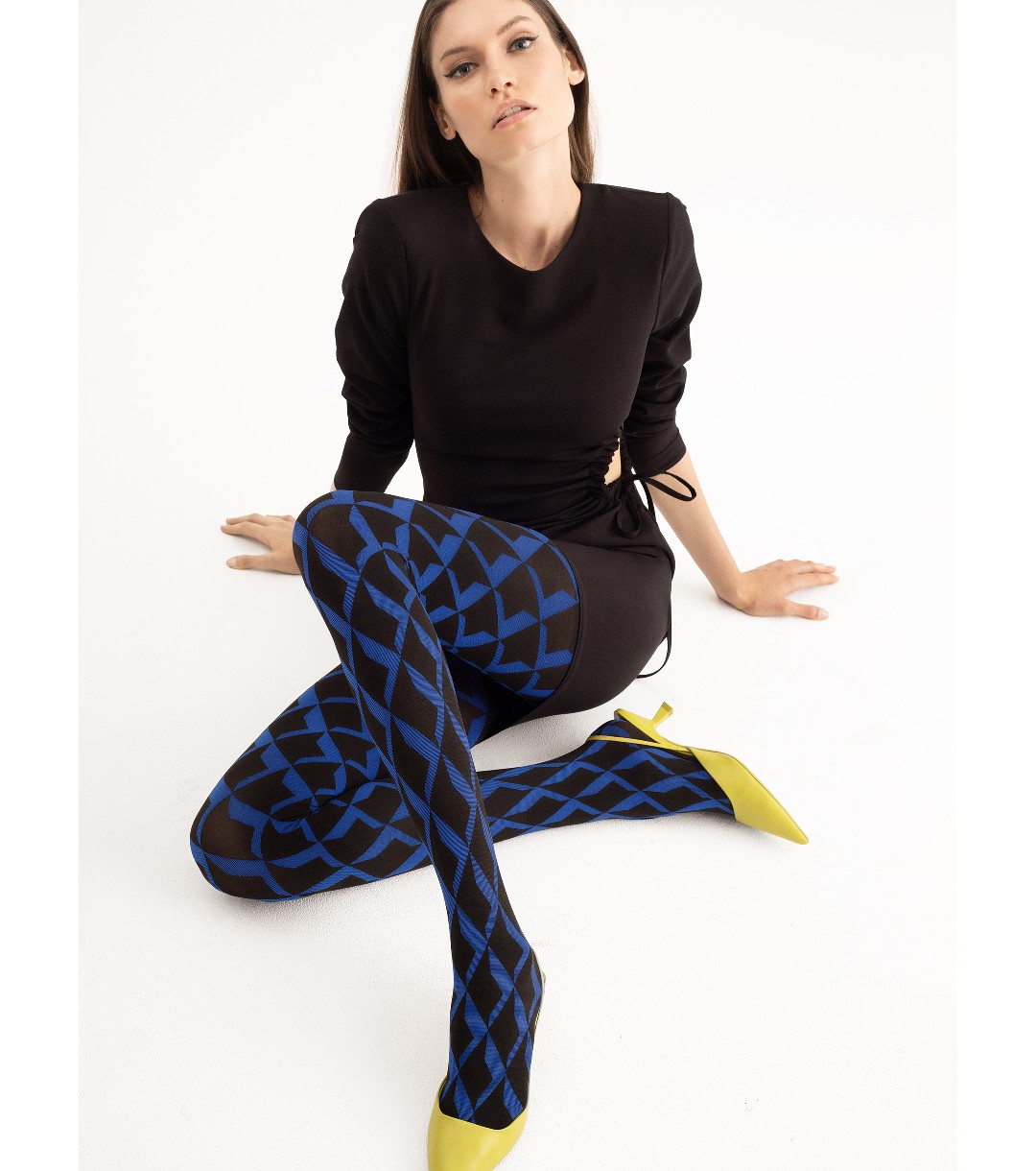 Fiore Colanți negri și 60 DEN RETRO BLUE Colanți modelați cu model geometric contrastant în stil retro