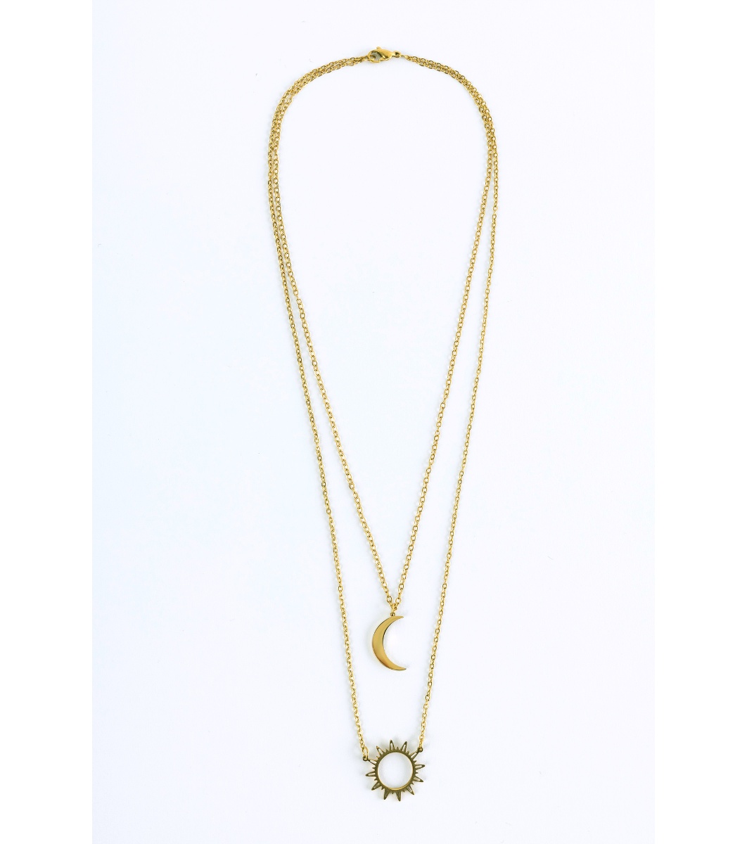 Colier auriu din oțel inoxidabil, cu două rânduri, cu lună și soare