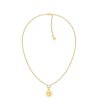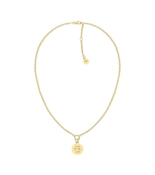 Colier elegant cu medalion rotund cu inscripție gravată.