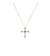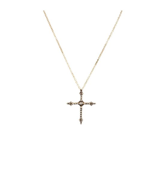 Un colier sofisticat cu un pandantiv în formă de cruce decorat cu multe pietre mici.