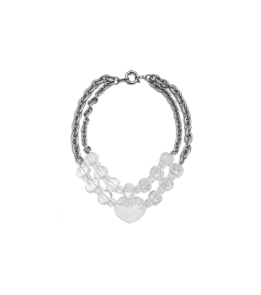Colier elegant cu două lanțuri și elemente decorative. Are un element central în formă de inimă și sfere, conferindu-i rafinament