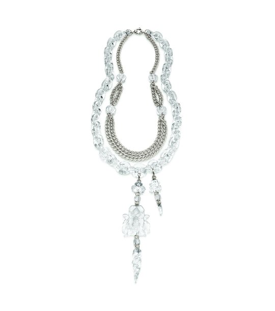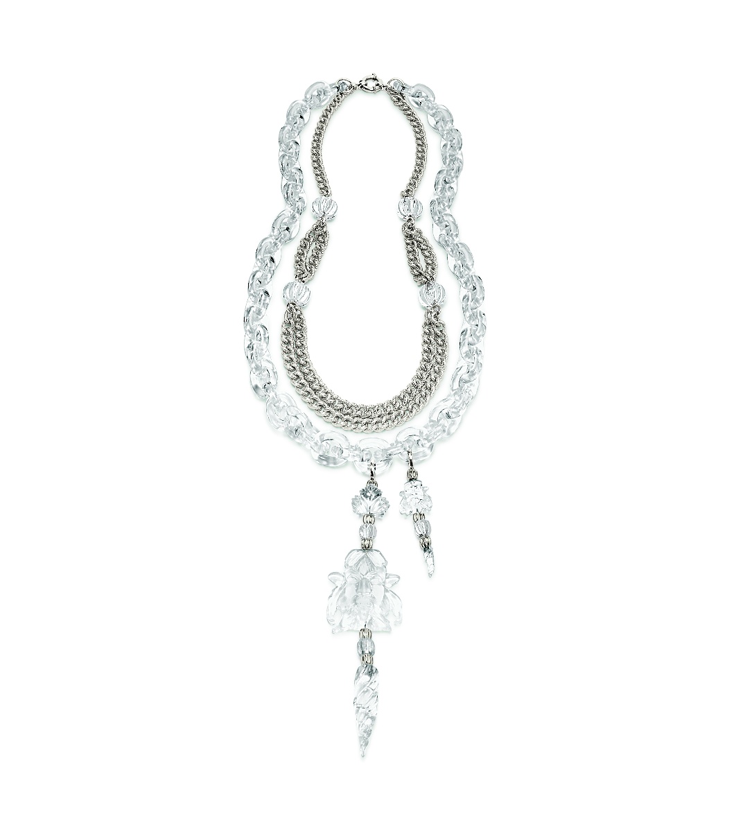 Colierul are un design elegant și include numeroase elemente decorative. Lanțul principal este combinat cu pandantive transparente, care adaugă rafinament și stil. Închizătoarea este de tip carabină, ceea ce asigură siguranță la purtare.