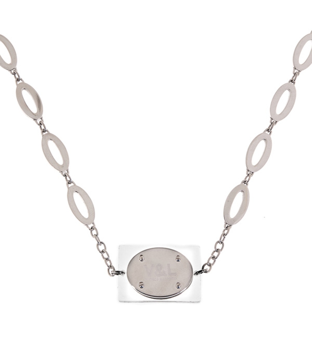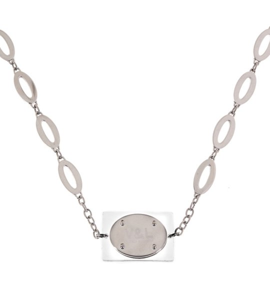 Colierul este realizat din elemente ovale conectate prin mici zale. Partea centrală include o placă ovală cu detalii gravate. Designul este curat și elegant, potrivit pentru diverse ocazii.