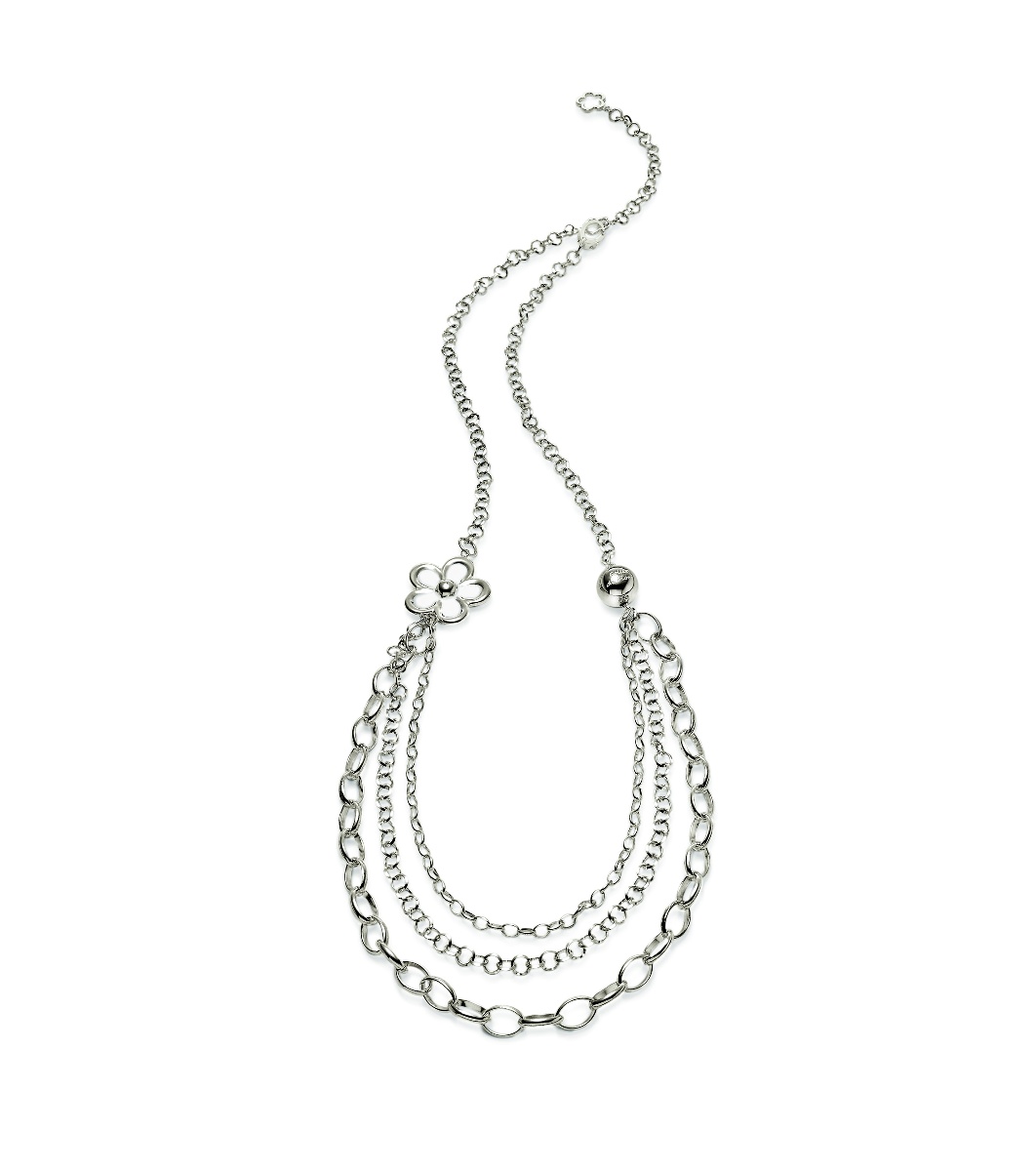 Colier rafinat de damă cu trei rânduri de lanțuri și o floare decorativă. Potrivit pentru diverse ocazii și ușor de combinat cu alte bijuterii.