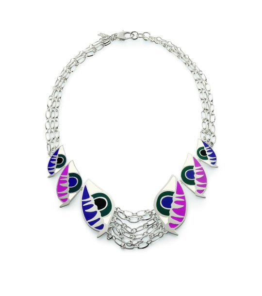 Colier elegant de damă cu un design unic, format din mai multe elemente conectate. Lanțul are zale împletite și o încuietoare robustă.