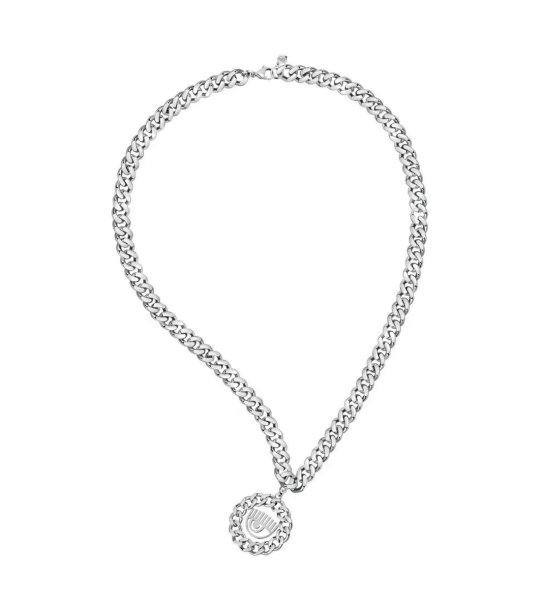 Colier elegant cu un lanț modern și o încuietoare tip carabină elegantă. Prezintă un element decorativ în partea de jos, care îi conferă un stil unic.