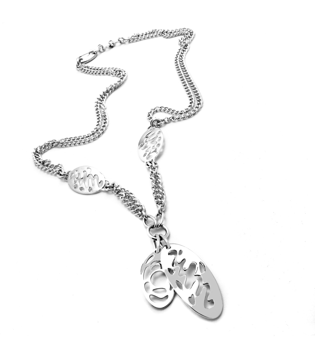 Colier elegant de damă cu mai multe lanțuri conectate și elemente decorative. Pandantivele au o formă interesantă și conferă un accent modern.