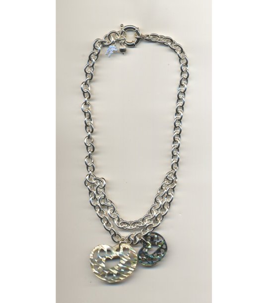 Colierul este alcătuit din zale și are două pandantive cu forme diferite. Unul dintre pandantive are o inimă decupată, în timp ce celălalt are un design diferit. Închiderea este cu o cataramă rotundă.
