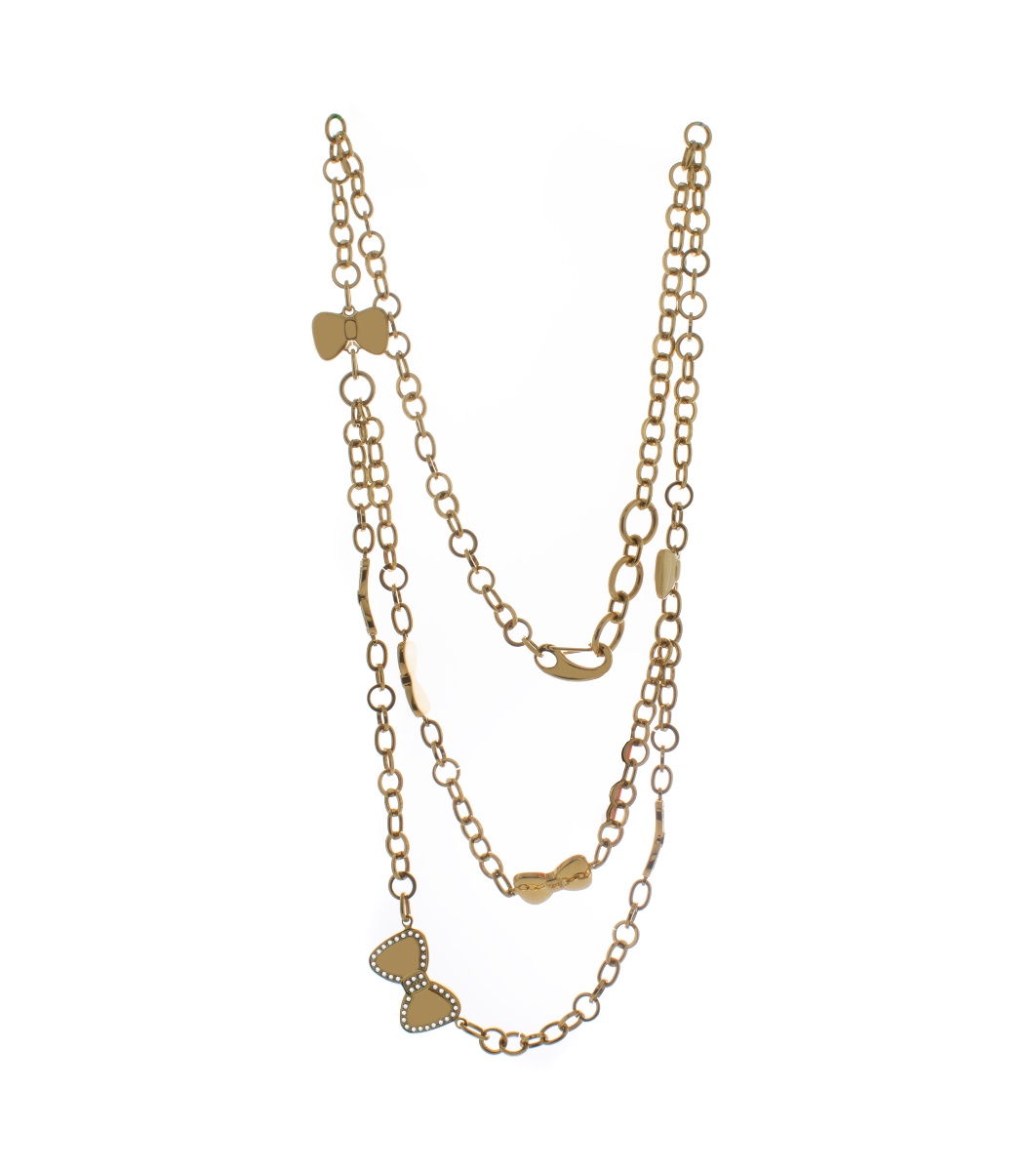 Un colier sofisticat pentru femei, format din mai multe rânduri de lanțuri. Lanțurile sunt decorate cu diverse elemente decorative, oferind un aspect elegant.