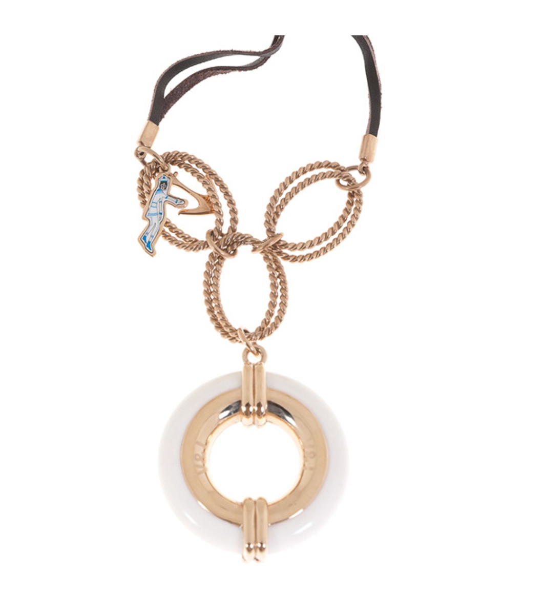 Colier elegant de damă, cu un design unic. Include un pandantiv rotund mare, conectat cu elemente decorative. Colierul se termină cu o încuietoare convenabilă.