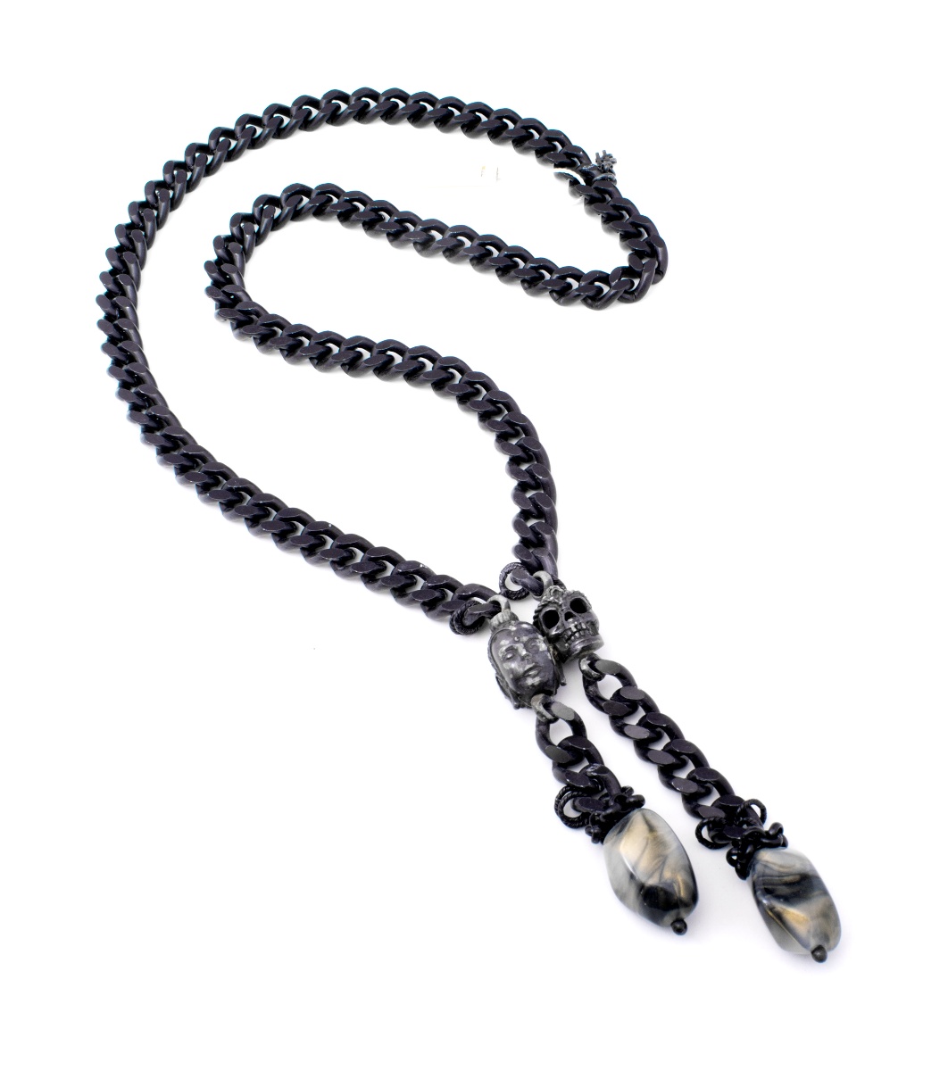 Colier elegant de damă cu lanț și elemente decorative în formă de cranii. Se remarcă printr-un design elegant și detalii stilate.