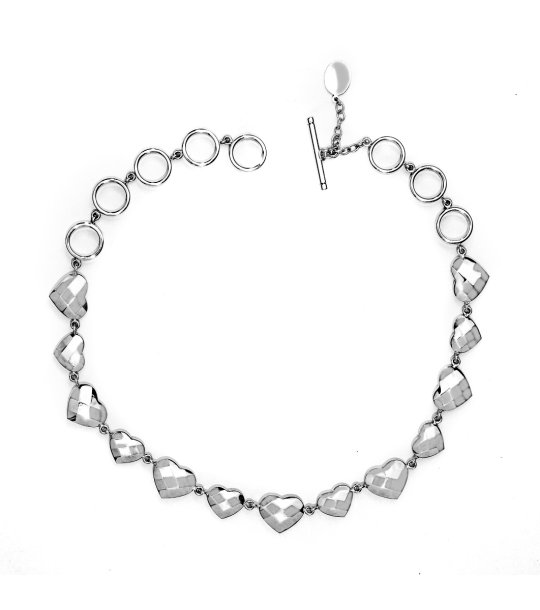 Colier elegant cu un design unic, combinând elemente în formă de inimioare și cercuri.