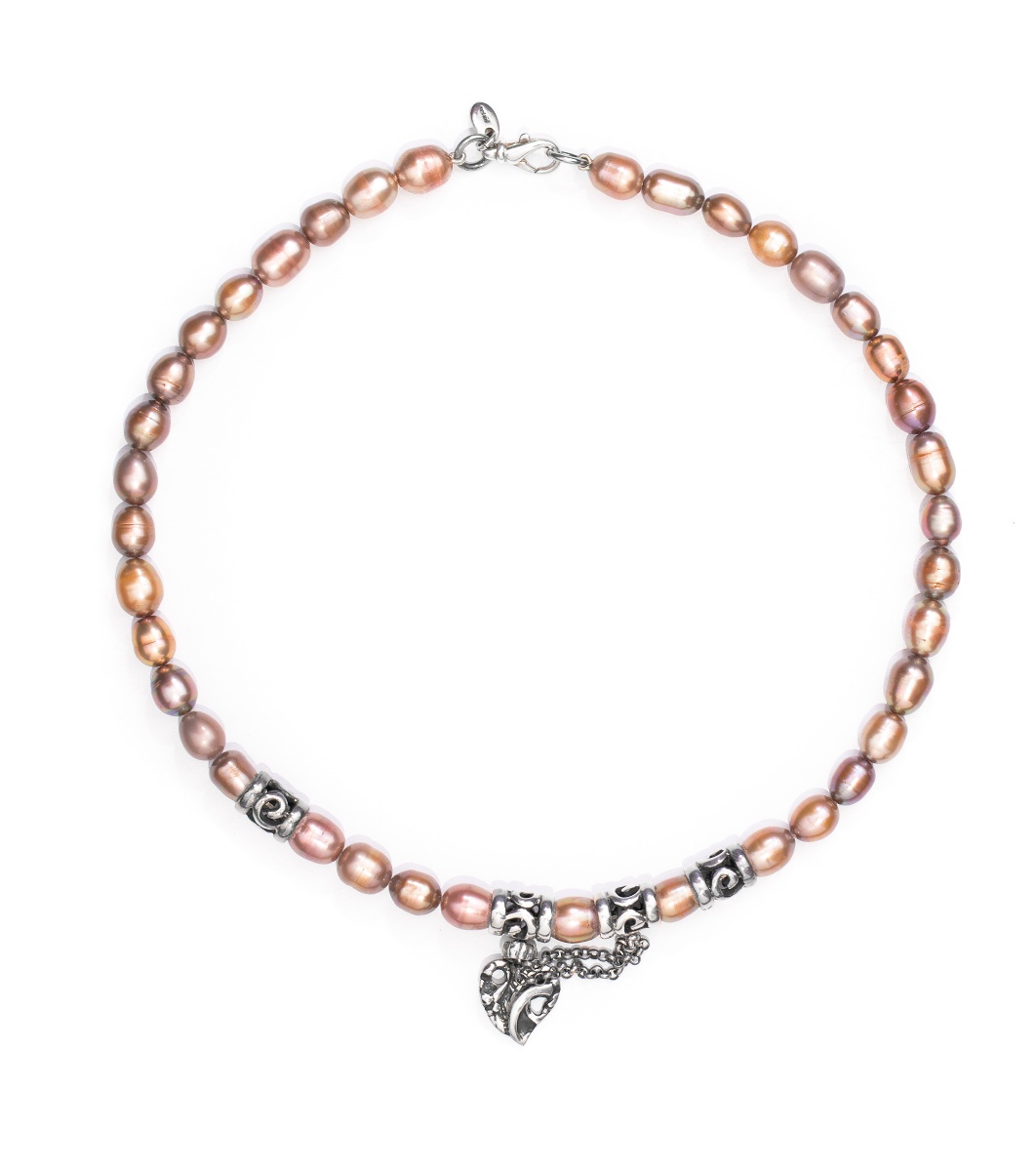 Un colier elegant, realizat din perle de diferite forme și dimensiuni. Se termină cu elemente decorative și un pandantiv în formă de inimă. Închizătoarea este de tip carabină, asigurând o fixare ușoară și sigură.