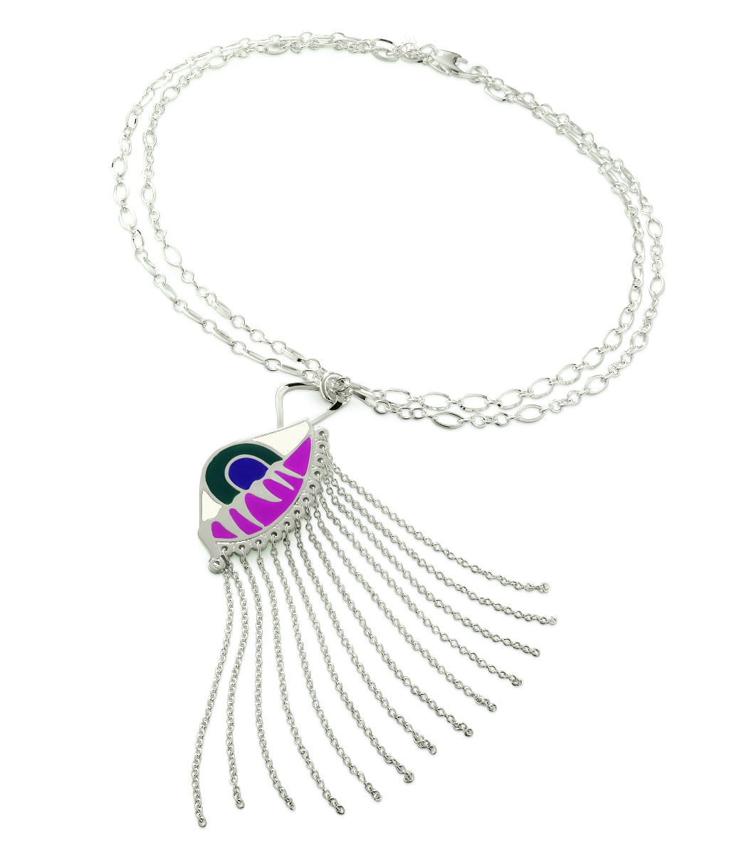 Colier de damă cu lanț dublu și pandantiv atractiv cu design abstract. Pandantivul este decorat cu franjuri lungi care îi conferă un aspect elegant. Închizătoarea este de tip carabină.