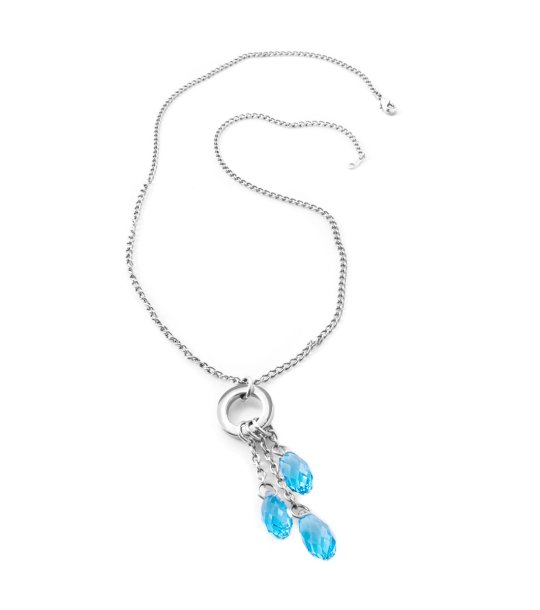 Colier elegant cu un lanț delicat și trei elemente decorative. Fiecare element are formă de lacrimă și este atașat de un inel metalic în centrul colierului.