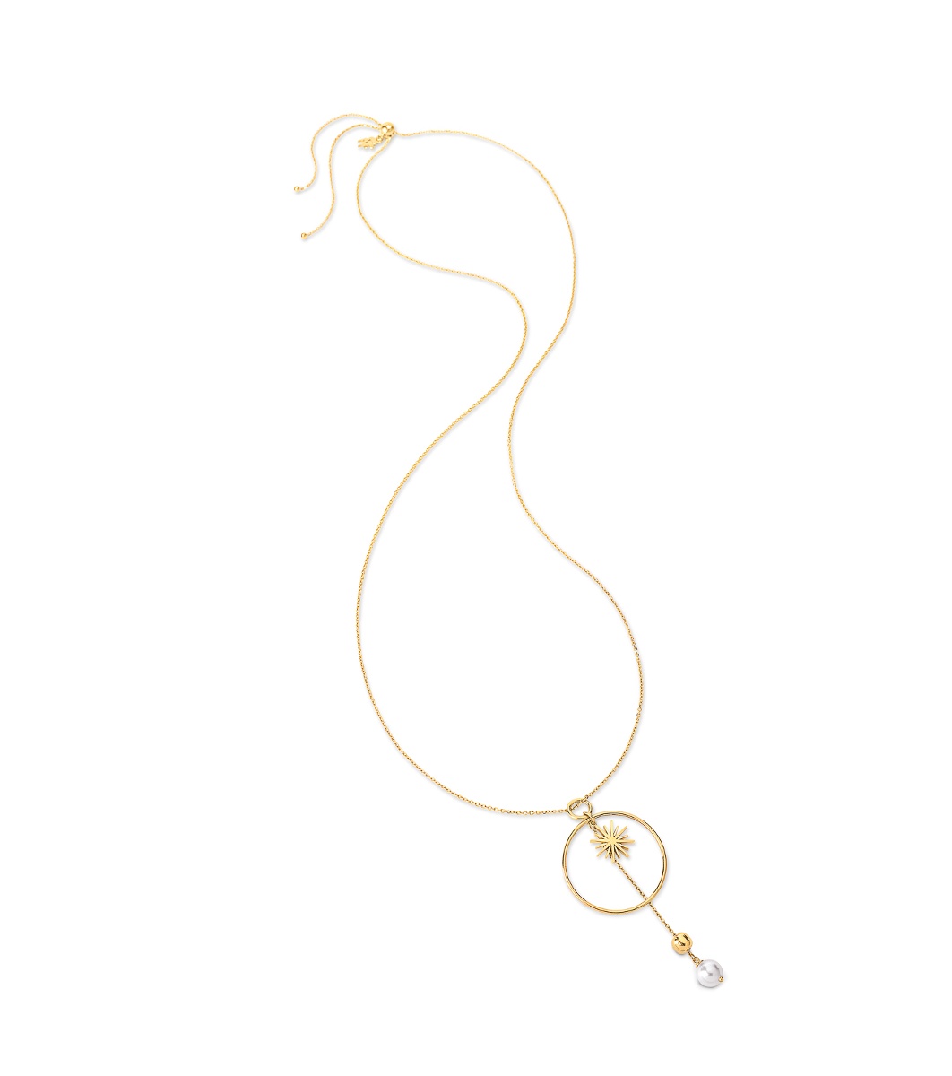 Colier elegant cu lanț subțire și pandantiv rotund. Pandantivul este decorat cu un pandantiv decorativ și o încuietoare reglabilă.