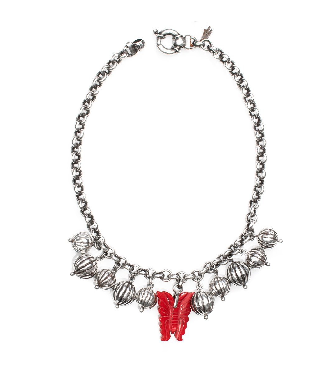 Colier sofisticat cu pandantive decorative și lanț metalic.