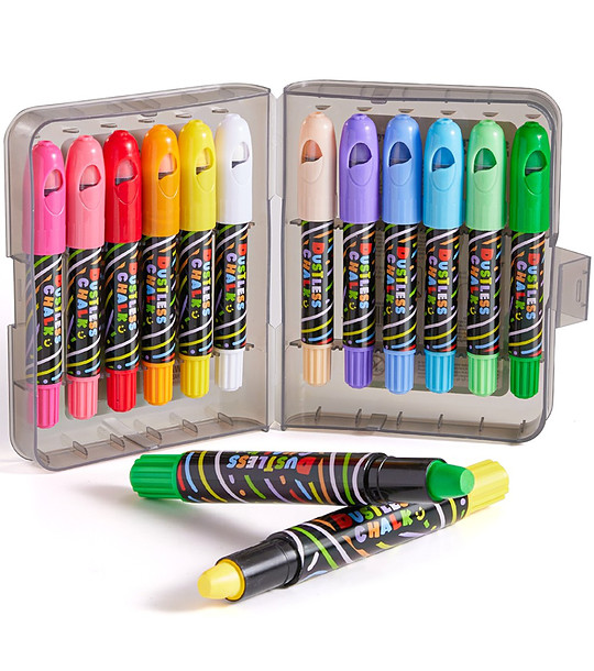 12 bucăți de cretă colorată fără praf, tip markere; cutie pentru depozitare ușoară;