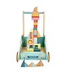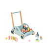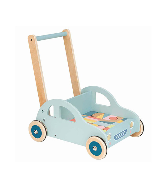 Cele patru roți sunt robuste, cu un strat de cauciuc, astfel încât căruciorul poate fi împins în siguranță și în liniște. Baia de încărcare este echipată cu 30 de blocuri de lemn colorate pe care copilul le poate stivui și împinge în mod repetat pentru a-și crea propriile structuri.