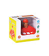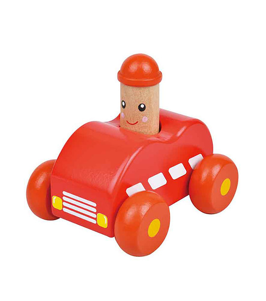 Jucăria este destinată copiilor peste 1 an. Un cărucior mic roșu cu un bărbat zâmbitor care scoate un scârțâit când este împins.