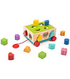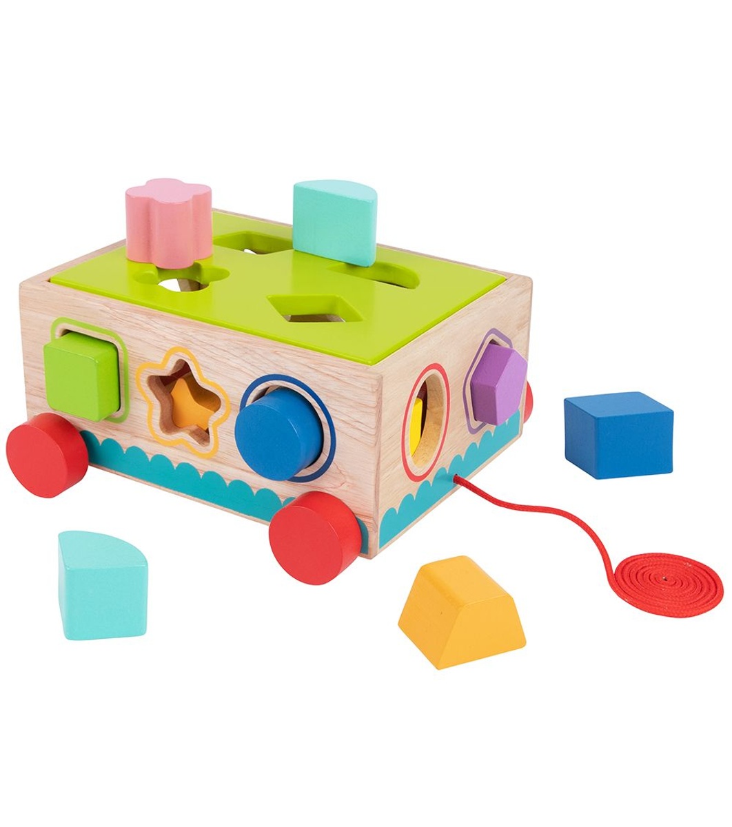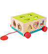 Tooky Toys Cărucior sortator din lemn Căruciorul sortator vesel are 14 cuburi de diferite forme și culori și 5 laturi din care acestea pot fi străpunse. Dacă cel mic nu este încă pregătit să le lovească ușor, culoarea potrivită este pictată în jurul fiecăreia dintre forme.