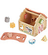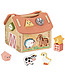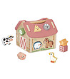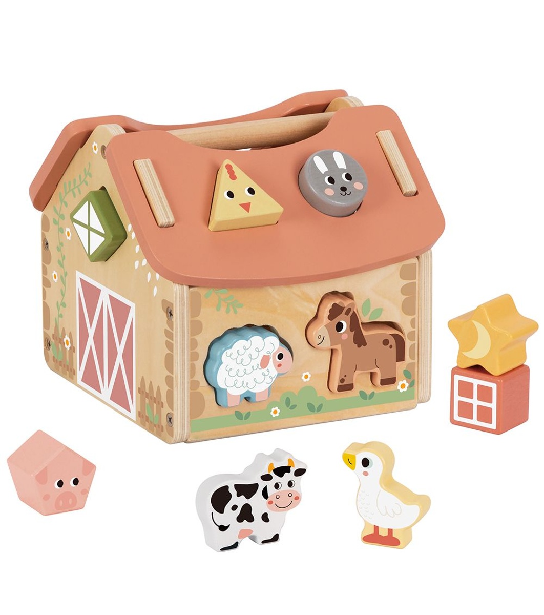 Ce include setul? Căsuță din lemn în stil fermă, cu un mâner de transport convenabil 4 animale din lemn - drăguțe și ușor de prins 6 forme geometrice pentru sortare