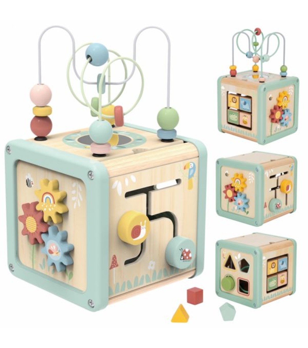 Conceput special pentru copiii de peste 18 luni, acest cub educațional din lemn 5 în 1 oferă o paletă bogată de activități care promovează dezvoltarea timpurie a copilăriei prin joc.