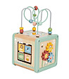 Ce include cubul? Labirint 3D cu mărgele colorate și o oglindă sigură (detașabilă și retractabilă la bază); sortator de forme colorate; figurine mobile (melc și buburuză) pe căi încorporate; mecanism cu angrenaje rotative; plăci pătrate din lemn cu imagini colorate diferite care se rotesc.