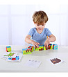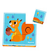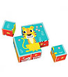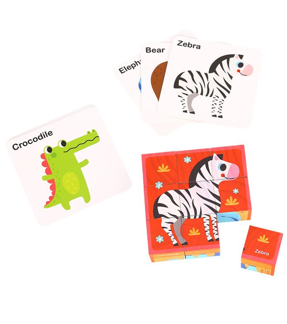Setul contine 9 cuburi de lemn cu poze, cu ajutorul carora copiii vor putea aranja sase poze diferite cu animale.