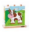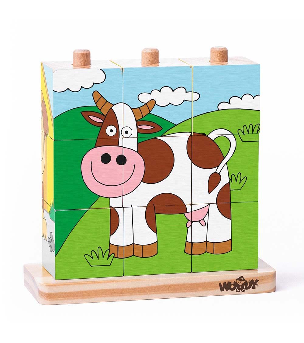 Jucăria îi introduce pe copii în lumea puzzle-urilor, ajutându-i să învețe în timp ce creează imagini colorate cu animale de fermă - un câine, un pisoi, o vacă și o oaie.