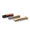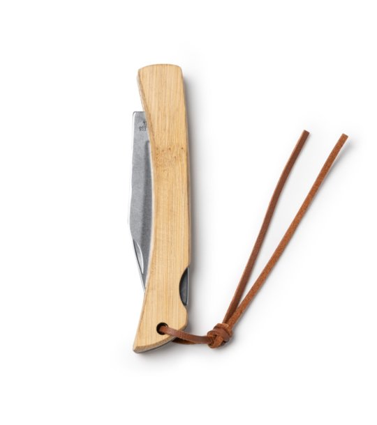 Cuțit pliabil din oțel inoxidabil cu mâner din bambus natural.