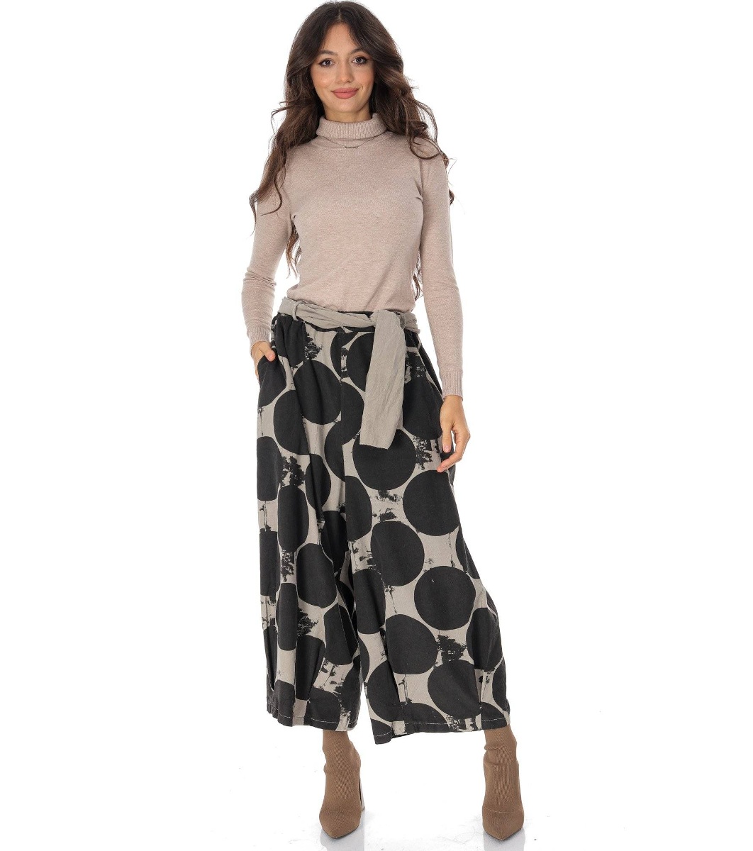 STYLE: TR559 Acești pantaloni type culotte, cu croială wide leg, sunt realizate dintr-o catifea fină de bumbac, caracterizată prin textură moale și flexibilă, cu un imprimeu contrasting crem care adaugă originalitate și eleganță. Talia elastică asigură confort maxim, fiind completată de găici pentru cure, două buzunare laterale funcționale și o curea detașabilă care permite personalizarea look-ului. Detailile de pense de la tiv oferă structură și un plus de stil, conturând o siluetă modernă și fluidă. Un articol versatile și în tendințe, perfect pentru Șinute casual-chic, ce poate fi portat cu ghete, sneakers sau loafers, adaptându-se cu diferite ocazii. Culoare: Negru/Bej Compozitie: 100% Bumbac Marime One Size/M Bust - Talie 72-84 (Elastic) Se vinde 120 Lungime 54 cm
