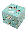 Deschideți capacul și întoarceți cheia - veți auzi o melodie fermecătoare și veți vedea cum micul pinguin se învârte în ritmul muzicii. Cutia are un mic sertar.