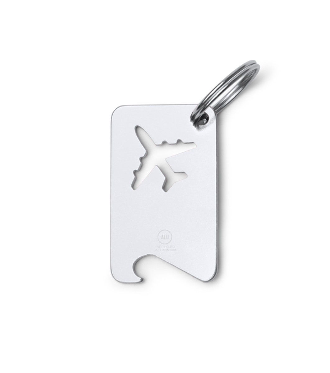 Breloc din aluminiu reciclat cu deschizător de sticle.