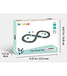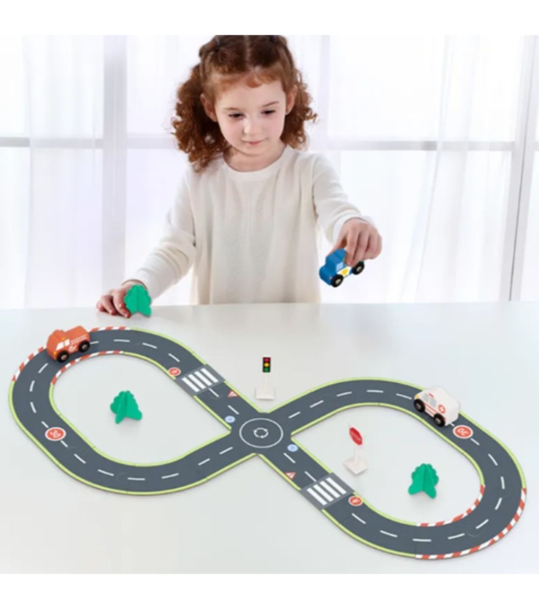. În set veți găsi cărucioare, clădiri și accesorii. Fabricate din lemn și vopsite cu vopsele sigure, acestea sunt ideale pentru dezvoltarea timpurie a copilăriei prin joc și imaginație. Setul include: secțiuni de drum care se conectează ca un puzzle; cărucioare din lemn, potrivite pentru mânuțele copiilor mici; accesorii precum copaci, indicatoare rutiere, semafoare, care ajută la crearea unui mediu urban realist. Jocul susține dezvoltarea abilităților motorii fine, gândirea logică și recunoașterea diferitelor elemente ale infrastructurii urbane.
