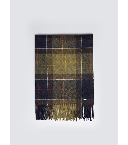 Eșarfă de damă cu model în carouri și franjuri scurte pe margini. Formă dreptunghiulară și textură moale.