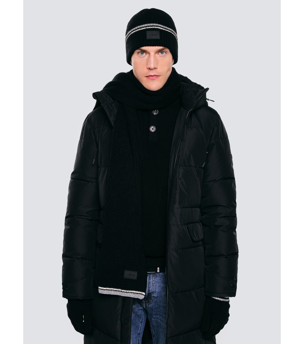 Big Star Eșarfă tricotată neagră pentru bărbați, cu bordură contrastantă WANDEGORS Eșarfă tricotată pentru bărbați, cu textură cu nervuri mari.
