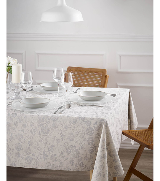 Model cu imitație de textură de in și model floral. Suprafața este tratată cu un strat dublu de rășină și un strat suplimentar de teflon cu efect hidrofug și antipete.